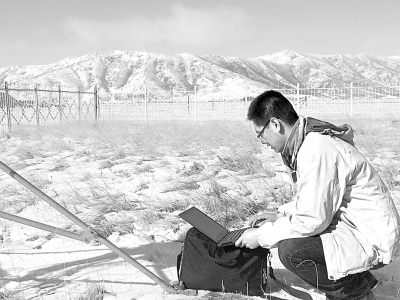 李奇在氣象監(jiān)測(cè)站的雪地上打開(kāi)計(jì)算機(jī)。