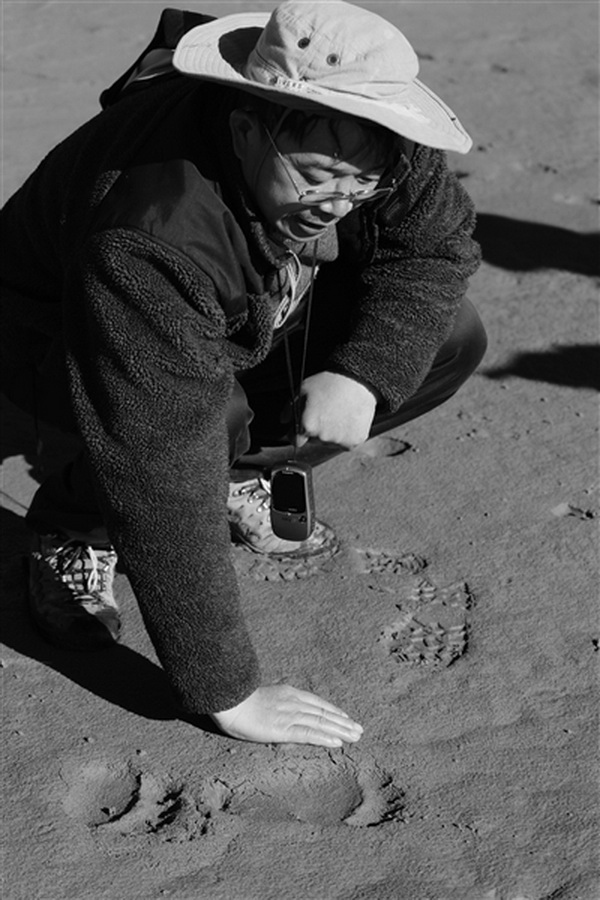 ?、?014年6月,在可可西里考察期間,蘇建平為大家講解棕熊腳印。
