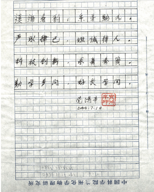 他將這32個(gè)字寫完,或許覺得筆跡太單薄、不夠清楚,他又顫顫巍巍地拿起筆,緩慢而用力地又描了一遍,連一個(gè)標(biāo)點(diǎn)符號(hào)都不忽略,最后鄭重地簽上了自己的名字,并加蓋了自己的私章??吹酱饲榇司?,來探望他的領(lǐng)導(dǎo)和學(xué)生無比感慨,無不動(dòng)容。寶貴的遺訓(xùn)彰顯著他嚴(yán)以律己、嚴(yán)謹(jǐn)治學(xué)、誠信科研、淡泊名利的崇高品格,他的風(fēng)范將長存于世,激勵(lì)著后來者。