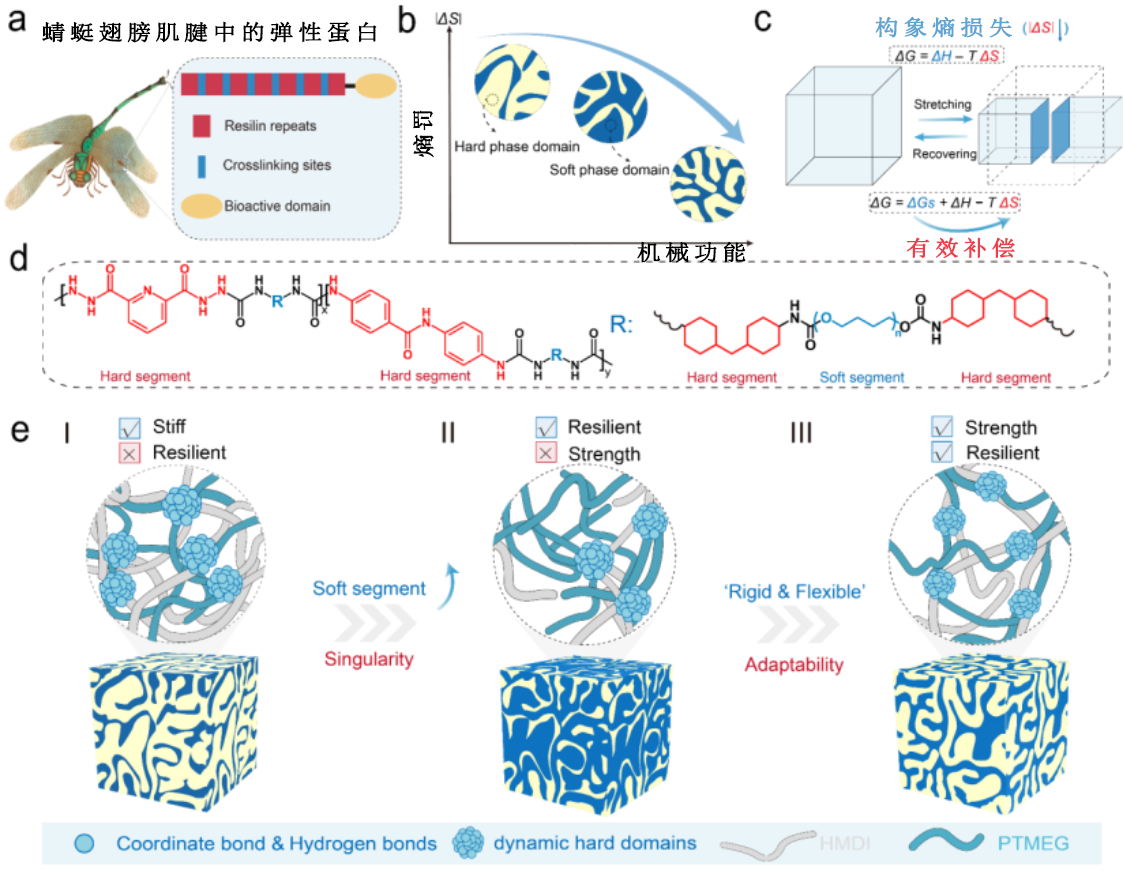 團(tuán)隊(duì)從分子層面動(dòng)手:先在聚氨酯分子里引入動(dòng)態(tài)氫鍵和配位鍵,像在分子內(nèi)部埋了“魔術(shù)拉鏈”,它們既能牢牢固定硬域的形狀,又能在拉伸時(shí)自動(dòng)解鎖。當(dāng)材料受到外力拉伸時(shí),硬域先分解,釋放了分子鏈的“自由度”,熵增加(形變?nèi)菀祝?;與此同時(shí),柔軟的鏈段會(huì)有序結(jié)晶,吸收能量,焓降低(彈性增強(qiáng));這種能量的“此消彼長(zhǎng)”讓材料變得又強(qiáng)又彈,一舉打破了“熵罰”難題。