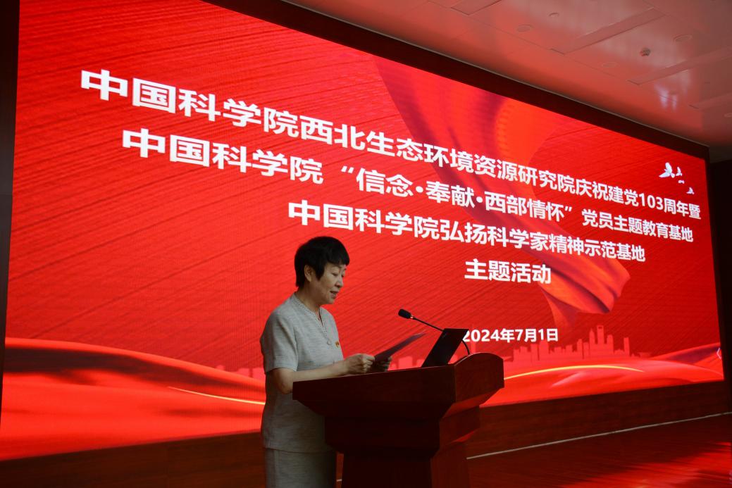 為慶祝中國共產(chǎn)黨成立103周年,7月1日,中國科學(xué)院西北生態(tài)環(huán)境資源研究院舉行中國科學(xué)院“信念·奉獻(xiàn)·西部情懷”黨員主題教育基地、中國科學(xué)院弘揚(yáng)科學(xué)家精神示范基地主題活動。西北研究院黨委委員、領(lǐng)導(dǎo)班子成員、紀(jì)委委員、院務(wù)委員,黨支部書記、支部委員,研究室(中心)、實(shí)驗(yàn)室、野外臺站和管理部門黨員負(fù)責(zé)人,黨員代表等參加活動。黨委副書記、紀(jì)委書記王萍主持活動。