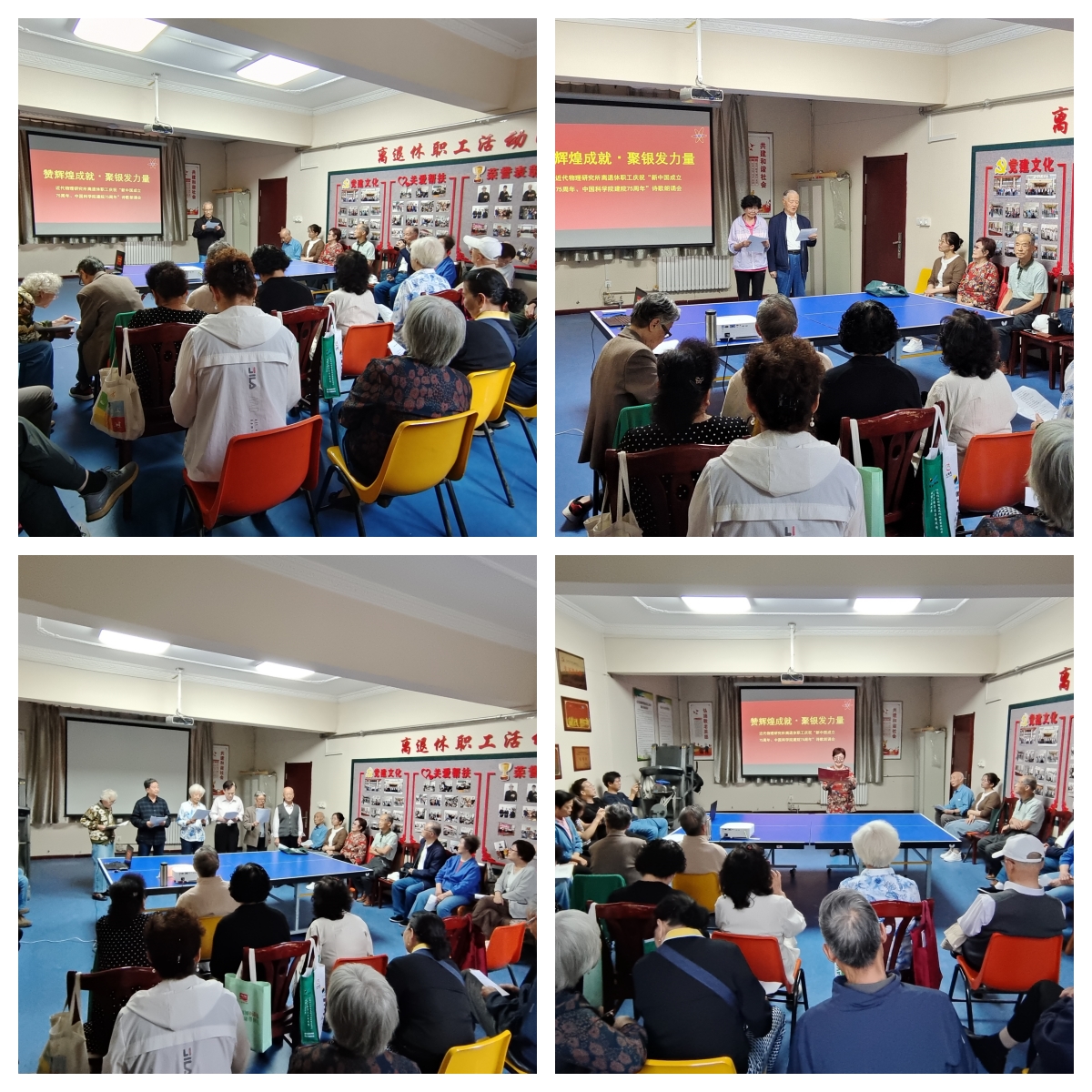 當天下午3點,活動在老專家衛(wèi)增泉朗誦的《七十五載的輝煌贊歌》中拉開了帷幕。接著,《為祖國奉獻》《祖國禮贊》《75周年贊》《75年輝煌贊歌》《歌頌神州》等30多首詩歌接連誦讀。老專家周景兮朗誦的原創(chuàng)佳作《美麗中國》回顧了中華民族從站起來、富起來到強起來的偉大飛躍。老研究員靳根明朗誦的自創(chuàng)詩歌,洞悉全球風云變幻,聚焦國際國內(nèi)新聞熱點,為大家傳遞了最新資訊。李君清、張?zhí)烀?、魏公琳、郭?yīng)祥、王素芳、韓國華六位老同志集體朗讀的《為祖國奉獻》,以鏗鏘之音深切表達對老一輩科學(xué)家為祖國無私奉獻的崇高敬意。大家以詩為媒,以文傳情,用質(zhì)樸無華的語言深情表達對祖國和中國科學(xué)院的無限熱愛。