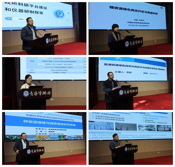 大會(huì)開始,鄭詩禮副所長(主持工作)首先介紹了召開此次戰(zhàn)略研討會(huì)的背景和意義。隨后,李武研究員、樊啟順研究員、王敏研究員、葉秀深研究員、劉海寧研究員及副所長馮海濤研究員圍繞鹽湖化學(xué)基礎(chǔ)研究、鉀資源增儲(chǔ)、鋰高效分離、鎂基結(jié)構(gòu)材料、鹽湖稀散元素和儀器設(shè)備平臺(tái)開發(fā)六個(gè)方向分別以《鹽湖資源綠色高效分離技術(shù)與應(yīng)用示范項(xiàng)目-基礎(chǔ)部分》《鉀資源增儲(chǔ)與提質(zhì)增效研究思路》《鋰資源綠色高效開發(fā)與高值利用》《強(qiáng)化關(guān)鍵科學(xué)與技術(shù)攻關(guān)加快推動(dòng)鹽湖鎂產(chǎn)業(yè)多元化高值化發(fā)展》《鹽湖銣銫溴碘硼高值元素資源增儲(chǔ)與分離提取》《青海鹽湖所科研平臺(tái)建設(shè)與儀器研制探索》為題作報(bào)告。