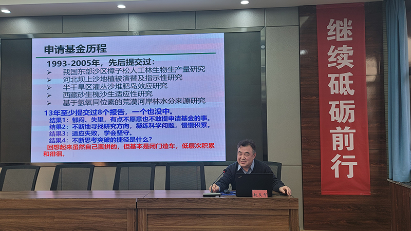 趙文智結(jié)合自身多年來承擔國家自然科學基金的申請歷程和作為專家的評審經(jīng)驗,圍繞項目申請書的撰寫、評審流程中的關(guān)鍵點,從選題的確定、摘要的凝練、立項依據(jù)和技術(shù)路線等方面詳細介紹了相關(guān)技巧和要領(lǐng),并提出了切實可行的申報建議;牛麗從基金管理的角度介紹了西北生態(tài)環(huán)境資源研究院近五年來自然基金申請和資助情況,重點圍繞項目申請中不予受理原因分析、本單位相關(guān)工作舉措和基金申請政策新變化等做了詳細闡述。最后,兩位專家與參會人員就“科學問題的發(fā)現(xiàn)凝練”、“項目申報限項”、“包干制”政策及基金申報過程中的重點難點進行了深入交流。