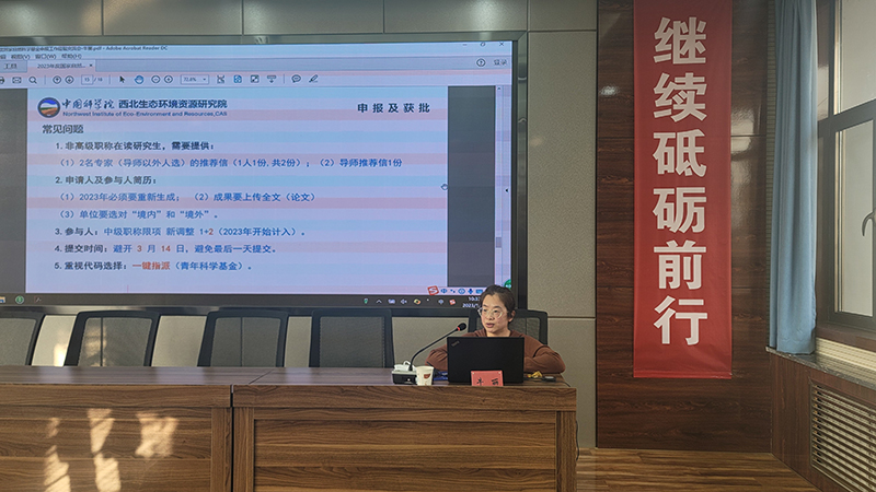 為落實蘭州分院與甘肅省科學院會商會議精神,幫助甘肅省科學院提升基金項目申報的水平和質(zhì)量,1月11日,蘭州分院與甘肅省科學院共同舉辦了國家自然科學基金申報培訓會。會議特邀西北生態(tài)環(huán)境資源研究院研究員、國家自然科學基金杰出青年基金獲得者趙文智,西北生態(tài)環(huán)境資源研究院科研管理處牛麗博士交流分享基金申報和管理經(jīng)驗。蘭州分院科技合作處、甘肅省科學院科研處、甘肅省科學院所屬研究所科研代表共計60余人參加會議。