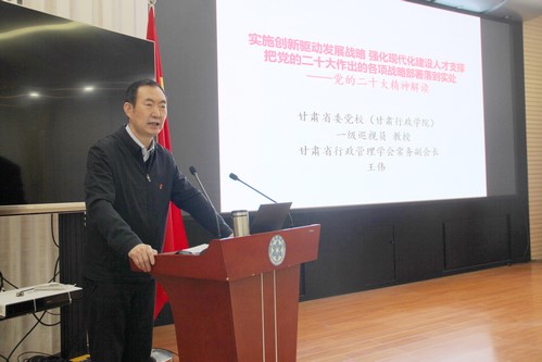 王偉教授以《實施創(chuàng)新驅(qū)動發(fā)展戰(zhàn)略 強化現(xiàn)代化建設人才支撐 把黨的二十大做出的各項戰(zhàn)略部署落到實處》為題,從深刻領會黨的二十大重大意義、全面學習把握落實黨的二十大精神和認真學習貫徹黨的二十大精神、堅定不移把黨中央決策部署落到實處三個部分,結合學員特點,以教育、科技、人才和干部等方面相關論述為重點,用生動形象的語言,系統(tǒng)全面解讀了黨的二十大報告的核心要義和豐富內(nèi)涵。