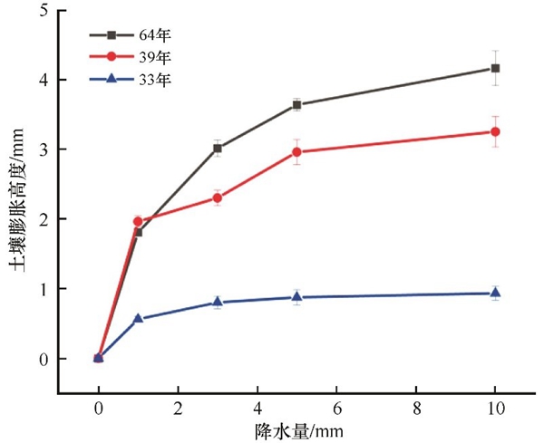 圖1 生物結(jié)皮作用下不同發(fā)育時間固沙植被區(qū)土壤膨脹高度隨降水量變化曲線