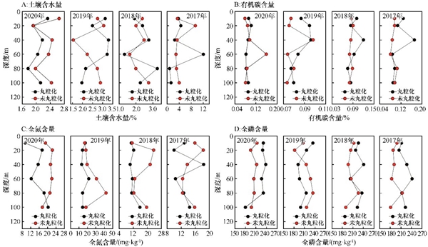 中國科學院西北生態(tài)環(huán)境資源研究院(以下簡稱西北研究院)司建華研究員團隊以阿拉善左旗騰格里沙漠飛播區(qū)為研究區(qū),采用空間替代時間方法,對比分析了2017—2020年種子丸?;臀赐枇;w播區(qū)植被生長狀況、土壤水分、養(yǎng)分和土壤微生物的變化情況。研究發(fā)現(xiàn):(1)飛播種子丸?;夹g應用后,丸?;^(qū)植物蓋度及地上、地下和總生物量分別以13.72%、395.88%、127.97%和526.16%的年增長率增加;未丸?;^(qū)各項指標增量明顯低于丸粒化播區(qū);(2)每個飛播年丸?;臀赐枇;^(qū)土壤含水量和養(yǎng)分之間差異性不明顯;隨著生長年限增加,土壤有機碳呈增加趨勢,土壤全氮含量呈減少趨勢,土壤全磷含量變化不大(圖1);(3)對8個樣地的土壤樣本提取DNA進行微生物群落分析,其中僅采自2017年及2019年丸?;^(qū)的樣本滿足后續(xù)測序要求,相比于2019年丸?;^(qū),2017年丸粒化播區(qū)土壤的Simpson指數(shù)出現(xiàn)了些許降低,而Sobs指數(shù)、Chao1指數(shù)和ACE指數(shù)均顯著增加,分別提高了46.67%、43.73%和43.91%??傮w上,飛播種子丸?;瘜Π⒗谱笃焐衬寥拉h(huán)境具有一定的改善作用。