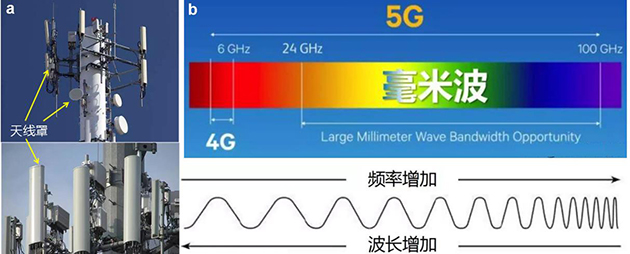 圖1. (a) 5G基站和 (b) 5G毫米波頻段
