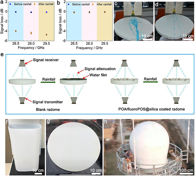 5G技術(shù)是我國(guó)重大戰(zhàn)略布局。目前,中國(guó)已建成全球最大5G網(wǎng)絡(luò),需大量5G基站支撐。5G天線罩是5G基站的重要組成部分(圖1a),用來(lái)保護(hù)天線系統(tǒng)免受外界復(fù)雜環(huán)境干擾,提高天線精度和使用壽命。5G信號(hào)目前采用<6 GHz頻段,未來(lái)將使用30-300 GHz毫米波(圖1b)。因此,5G信號(hào)易受外部干擾,尤其是“雨衰效應(yīng)”。降雨時(shí),雨水會(huì)在5G天線罩表面形成水滴或水膜。由于介電常數(shù)很高(~80,25℃),水會(huì)吸收、反射大量電磁波,導(dǎo)致5G信號(hào)嚴(yán)重衰減。