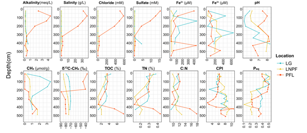 圖1 海岸凍土帶三個熱融湖塘湖相沉積層的孔隙水化學(xué)特征。 縱軸表示從沉積層表面開始的深度。 其中LG和LNPF為淡水環(huán)境的熱融湖塘,PFL為熱融瀉湖。其沉積層表層分別位于湖面以下 510、560 和 310cm處