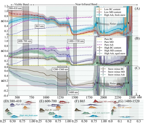 基于上述科學(xué)問題,研究團(tuán)隊(duì)在中國(guó)典型積雪區(qū),使用多角度光譜測(cè)量?jī)x器在人工分布和自然沉積條件下獲得了不同含量黑碳/沙塵/灰分的積雪半球定向反射系數(shù)(Hemispherical Directional Reflectance Factor, HDRF)數(shù)據(jù)集。研究發(fā)現(xiàn),LAIs引起的積雪反射率擾動(dòng)是非線性減速的,即每ppm LAIs對(duì)積雪反射率的削減隨積雪污染的增加而減小。當(dāng)存在足夠的黑碳時(shí),雪反射率可能會(huì)保持較低水平而不會(huì)迅速下降,黑碳引起的積雪暗化可能在其濃度處于數(shù)千ppm時(shí)達(dá)到飽和。測(cè)量表明,極高的LAIs濃度水平可能會(huì)增加其消光范圍,黑碳可以使整個(gè)測(cè)量范圍內(nèi)(350-2500 nm)的積雪暗化,而沙塵和灰分只能影響到1200 nm之前(350-1200 nm)。含沙塵或灰分的積雪分別在600和700 nm左右出現(xiàn)光譜斜率突變點(diǎn)。大量沙塵或灰分顆粒的沉積可使1400 nm波段以外的積雪反射率增加,沙塵增加0.1,灰分增加0.2。該研究結(jié)果促進(jìn)了黑碳、沙塵和灰分對(duì)積雪角反射模式影響的全面理解,有助于進(jìn)一步了解吸光雜質(zhì)、模擬臟雪中的反照率以及估算污染物含量。