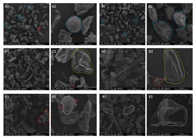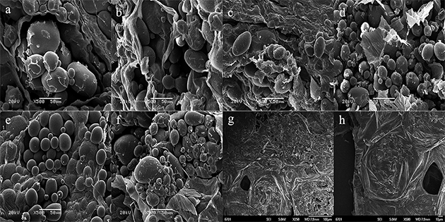 圖2 洋芋攪團(tuán)的口腔-胃-小腸體外模擬消化SEM照片