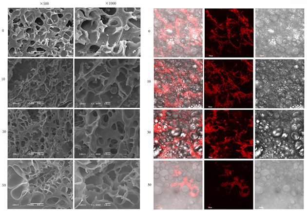 圖4 不同添加比例的馬鈴薯生全粉對(duì)小麥面筋微觀網(wǎng)絡(luò)結(jié)構(gòu)的影響