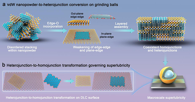 近日,研究人員在面向工程應(yīng)用的宏觀(guān)結(jié)構(gòu)超潤(rùn)滑尺度設(shè)計(jì)與實(shí)現(xiàn)等方面取得新進(jìn)展。以往結(jié)構(gòu)超潤(rùn)滑研究局限于由兩個(gè)晶體表面組成的單個(gè)有限尺寸(納米或微米量級(jí))摩擦結(jié)上,公度與非公度轉(zhuǎn)變機(jī)理是解釋單個(gè)摩擦結(jié)滑動(dòng)行為的基本科學(xué)原理,這導(dǎo)致結(jié)構(gòu)超潤(rùn)滑規(guī)模放大途徑集中于如何制備大尺寸二維單晶材料和如何實(shí)現(xiàn)其在工程支撐基底上無(wú)破壞轉(zhuǎn)移,阻礙了結(jié)構(gòu)超潤(rùn)滑的宏觀(guān)放大和工程應(yīng)用。因此,探索實(shí)現(xiàn)商業(yè)規(guī)模生產(chǎn)的范德華異質(zhì)納米粉體的宏觀(guān)超滑途徑至關(guān)重要。然而,范德華異質(zhì)納米粉體摩擦前難以形成有序結(jié),同時(shí)形成有序摩擦結(jié)后大量有限尺寸結(jié)之間非常復(fù)雜的接觸重構(gòu),對(duì)實(shí)現(xiàn)范德華異質(zhì)納米粉體的宏觀(guān)結(jié)構(gòu)超潤(rùn)滑提出了重大挑戰(zhàn)。