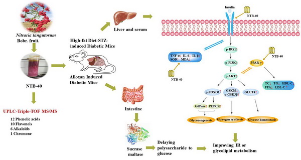 該研究建立了四氧嘧啶誘導(dǎo)的糖尿病小鼠模型,評(píng)價(jià)了NTB-40不同劑量(100,200,400 mg/kg)降低糖尿病小鼠餐后血糖的情況。淀粉/蔗糖酶/麥芽糖耐量實(shí)驗(yàn)證實(shí)NTB-40中高劑量組能夠顯著降低糖尿病小鼠餐后血糖。建立高脂飲食-STZ誘導(dǎo)的糖尿病小鼠模型,研究NTB-40長(zhǎng)期給藥對(duì)糖尿病小鼠糖脂代謝和IR的影響。結(jié)果顯示NTB-40可以通過(guò)維持葡萄糖穩(wěn)態(tài)(FBG、OGTT、ITT、FINS和HOMA-IR)和脂質(zhì)穩(wěn)態(tài)(TC、TG、HDL-C、LDL-C和FFA)從而改善糖脂代謝紊亂和胰島素抵抗,并能減少炎癥(IL-6、IL-1β和TNF-α)和氧化應(yīng)激(SOD和MDA)反應(yīng),減輕肝臟組織損傷。機(jī)制研究證實(shí),NTB-40能夠通過(guò)調(diào)節(jié)IRS1/PI3K/AKT信號(hào)通路和下游蛋白FOXO1、GSK3β、GLUT4的表達(dá),從而降低糖異生,促進(jìn)糖原合成和葡萄糖攝取,實(shí)現(xiàn)改善胰島素抵抗的作用效果。