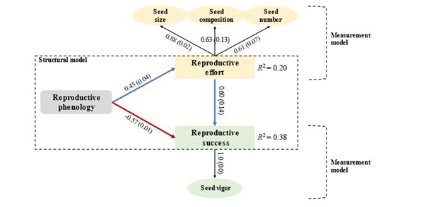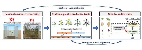 基于此,中國科學(xué)院西北生態(tài)環(huán)境資源研究院(以下簡稱西北研究院)科研人員以科爾沁沙地優(yōu)勢固沙灌木小葉錦雞兒(Caragana microphylla)為研究對象,探究了不同時段增溫對其繁殖物候和種子繁殖力的影響及差異,并從繁殖努力和繁殖成功角度分析了種子繁殖應(yīng)對季節(jié)非對稱性增溫的響應(yīng)策略(圖1)。研究發(fā)現(xiàn),繁殖物候通過提前開始、推遲結(jié)束、延長持續(xù)期和降低同步性來適應(yīng)季節(jié)非對稱性增溫(圖2),同時這種適應(yīng)分別增加和阻礙了種子的繁殖努力和成功(圖4)。繁殖物候適應(yīng)性、種子繁殖努力和成功與生長季溫度和增溫時長呈正相關(guān),而生長季前增溫對繁殖努力和成功均有負面影響(圖3-4)。該研究結(jié)果表明,增溫的季節(jié)非對稱性和持續(xù)時間,可通過調(diào)整繁殖物候模式和種子繁殖性狀來改變種子繁殖策略,其中生長季前較暖的冬季和春季降低了半干旱沙區(qū)固沙灌木小葉錦雞兒種子的繁殖力。