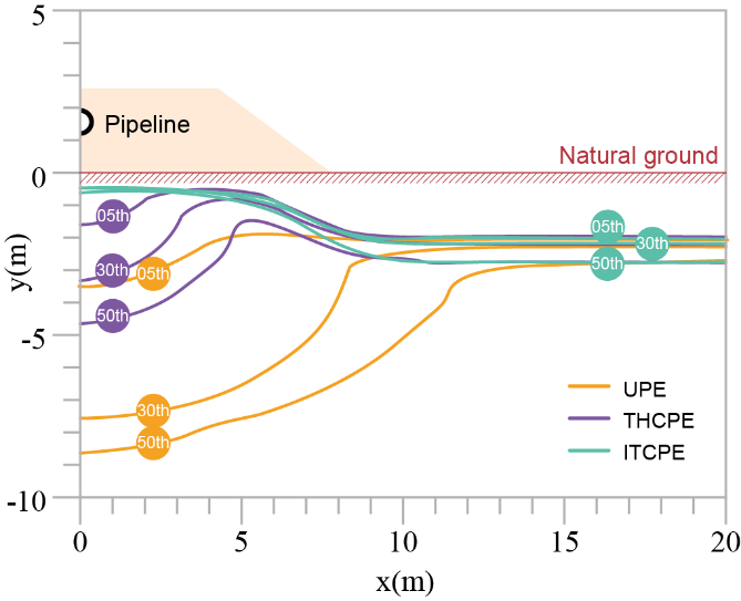 基于上述科學(xué)問題,中國科學(xué)院西北生態(tài)環(huán)境資源研究院科研團(tuán)隊(duì)研究提出一種新型倒T型碎石管道路堤(ITCPE)結(jié)構(gòu),該結(jié)構(gòu)基于“煙囪效應(yīng)”原理,利用管道自身熱量強(qiáng)化對流,可更有效地帶走管道熱量,冷卻凍土。此外,基于現(xiàn)場監(jiān)測系統(tǒng)的實(shí)測邊界,結(jié)合多孔介質(zhì)及相變理論,對ITCPE、無保護(hù)管道路堤(UPE)和傳統(tǒng)水平碎石管道路堤(THCPE)結(jié)構(gòu)在長期運(yùn)行過程中的熱效應(yīng)進(jìn)行了長期數(shù)值預(yù)測。研究結(jié)果表明,無論是有保溫層的埋地管道結(jié)構(gòu)、無防護(hù)的管堤結(jié)構(gòu),還是傳統(tǒng)的水平碎石管堤結(jié)構(gòu),都無法很好地解決中俄原油管線融沉問題。但新型ITCPE結(jié)構(gòu)可以有效減緩管道融沉問題,而且在管道運(yùn)營50年內(nèi)可顯著維持管堤下伏凍土的人為凍土上限高度。相關(guān)研究結(jié)果為中俄原油管線提供了技術(shù)支持,同時也為全球多年凍土區(qū)其他管道工程的設(shè)計(jì)和維護(hù)提供科學(xué)參考。