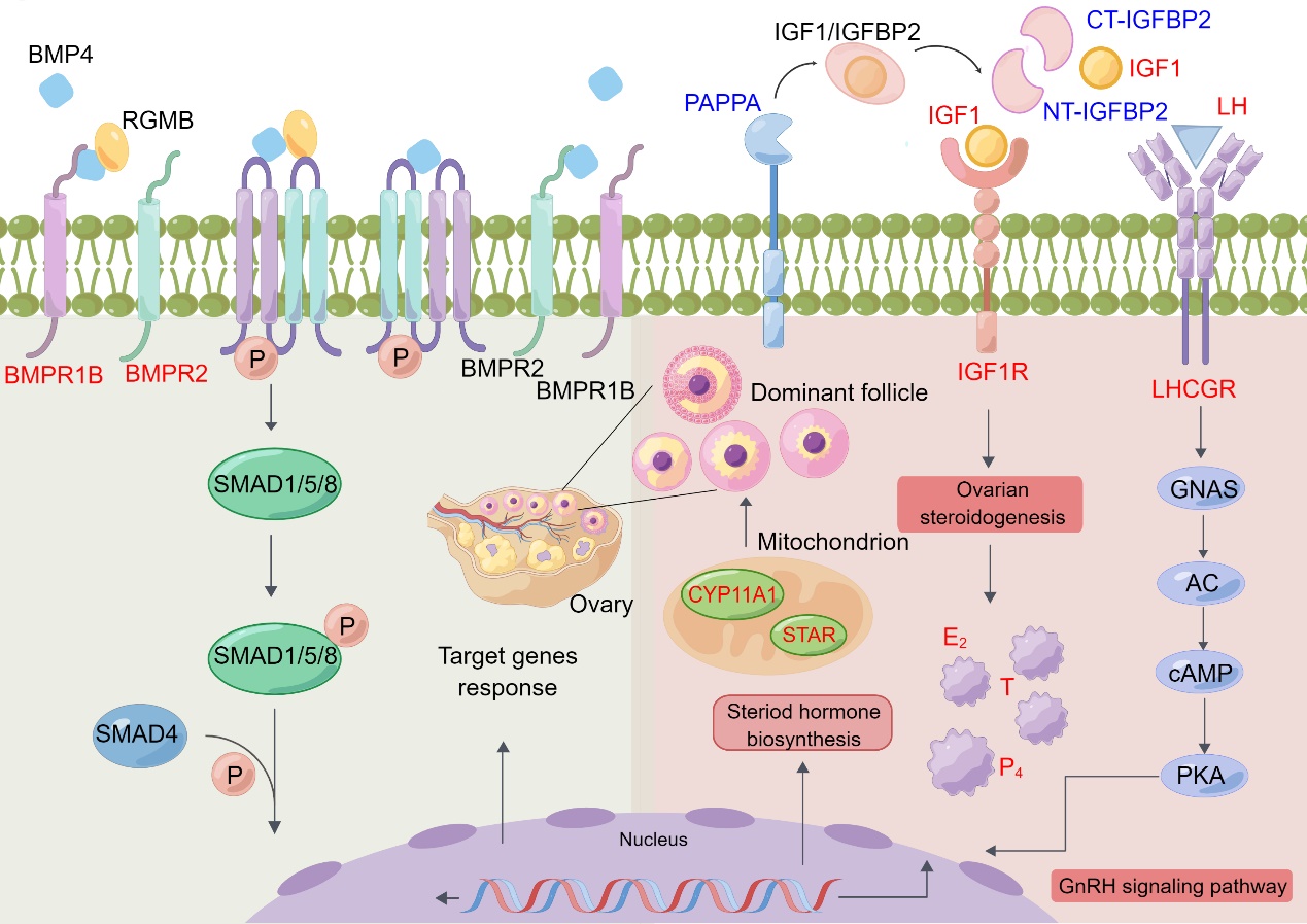 中國科學院西北高原生物研究所動物生態(tài)與資源保護研究團隊針對綿羊重要繁殖性狀(產(chǎn)羔數(shù)和產(chǎn)羔間隔),以連續(xù)三個產(chǎn)羔季節(jié)產(chǎn)多胎(每胎產(chǎn)兩羔或三羔,HF)和產(chǎn)單胎(每胎產(chǎn)一羔,LF)的藏羊為研究對象,整合全基因組關聯(lián)分析、普通轉錄組學、單細胞轉錄組學、蛋白質組學和代謝組學等多組學研究方法,結合KASP基因分型、實時熒光定量PCR、酶聯(lián)免疫吸附實驗、免疫共沉淀和蛋白質免疫印跡等分子功能驗證實驗,挖掘藏羊產(chǎn)羔數(shù)和產(chǎn)羔間隔關鍵調控元件并揭示其高繁殖力的遺傳調控機制。全基因組關聯(lián)研究表明,BMPR1B基因與產(chǎn)羔數(shù)性狀相關,PAPPA基因與產(chǎn)羔間隔性狀相關。首次構建了藏羊卵巢單細胞圖譜,發(fā)現(xiàn)關鍵基因PAPPA特異性表達在壁層顆粒細胞亞群,且BMPR1B基因在壁層顆粒細胞和固醇生成顆粒亞群高表達?;趩渭毎D錄組學、蛋白質組學和代謝組學整合分析,發(fā)現(xiàn)PAPPA是刺激卵巢優(yōu)勢卵泡生長發(fā)育和類固醇生成的關鍵候選基因。繁殖主效基因BMPR1B除了非同義突變,首次在藏羊中發(fā)現(xiàn)BMPR1B還存在可變剪接事件調控多胎性狀。該研究結果對分子精準選育提升藏羊繁殖力和實現(xiàn)藏羊產(chǎn)業(yè)提質增效具有重要意義。