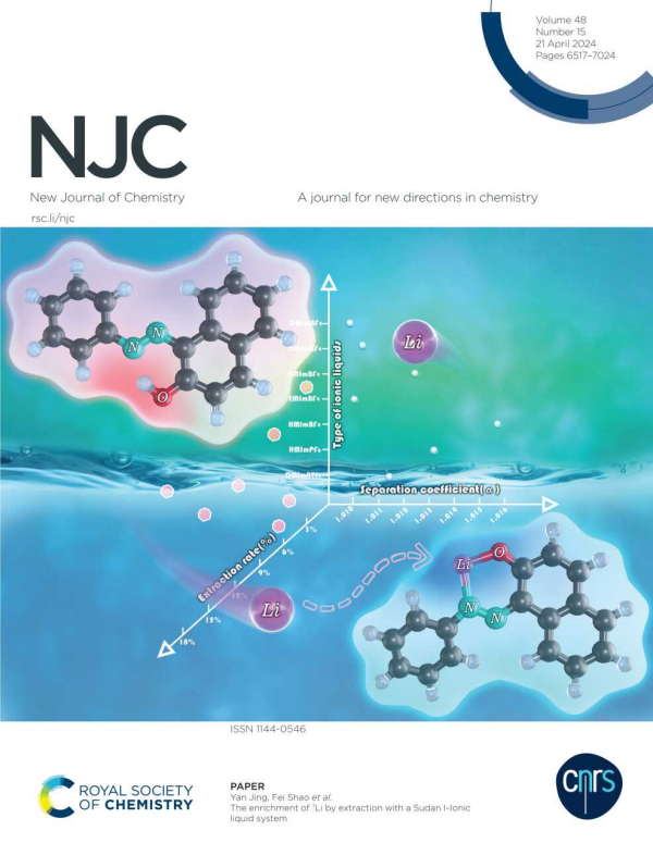 中國科學院青海鹽湖研究所同位素分離與化學品精制課題組針對蘇丹Ⅰ(1-苯基偶氮-2-萘酚)萃取富集7Li分離效應低問題開展研究。基于離子液體在鋰同位素分離體系中表現出優(yōu)異的協(xié)萃性能,將離子液體引入蘇丹Ⅰ體系中,構建蘇丹離子液體(Ⅰ-[HMIm][BF4])萃取體系,極大提高了蘇丹Ⅰ對7Li的分離能力。蘇丹Ⅰ與Li+是1:1進行絡合,過程中離子液體在跨界面遷移中主要起輔助作用,離子液體陰離子親水性越強,其輔助萃取作用越強,且計算表明離子液體的陰離子極有可能參與了蘇丹Ⅰ與鋰離子的配位。此研究成果在New Journal of Chemistry期刊發(fā)表封面學術論文一篇,SCI收錄。