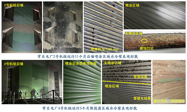 中國科學院蘭州化學物理研究所低碳能源材料組高祥虎研究員團隊近年來圍繞電站關鍵材料,專注于大型電站鍋爐輻射受熱面防護與節(jié)能增效關鍵技術研究。團隊研發(fā)的納米高熵防護與節(jié)能增效陶瓷涂層,突破了陶瓷材料防結焦、耐高溫腐蝕、紅外增效、高導熱率、熱膨脹系數(shù)可調等關鍵技術,同時具有降低煤耗、提高煤種適應性的多功能特點,可滿足大型調峰電站及其他常規(guī)電站的使用需求。在常樂電廠的大力支持下,該材料先后在其2號、4號機組開展應用。在爐膛服役1年后,使用了涂層材料的水冷壁管壁表面光滑致密、無結焦、附著物易清除、未出現(xiàn)凹坑和管壁減薄等腐蝕情況,表現(xiàn)出優(yōu)異的耐高溫腐蝕和防結焦性能。經西安熱工研究院有限公司現(xiàn)場檢測,管壁厚度較噴涂前無明顯變化。對照相同區(qū)域未噴涂防護涂層的水冷壁表面均出現(xiàn)明顯的腐蝕凹坑,并附著有褐色的腐蝕產物。