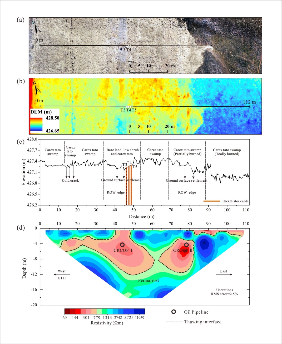 此外,本研究還討論了氣候變暖、火災(zāi)和人為活動等對凍土環(huán)境的影響,闡明了多種因素影響下管周融區(qū)與地表特征的演變過程。研究結(jié)果為中俄原油管道的安全運(yùn)維提供了重要數(shù)據(jù)支撐。