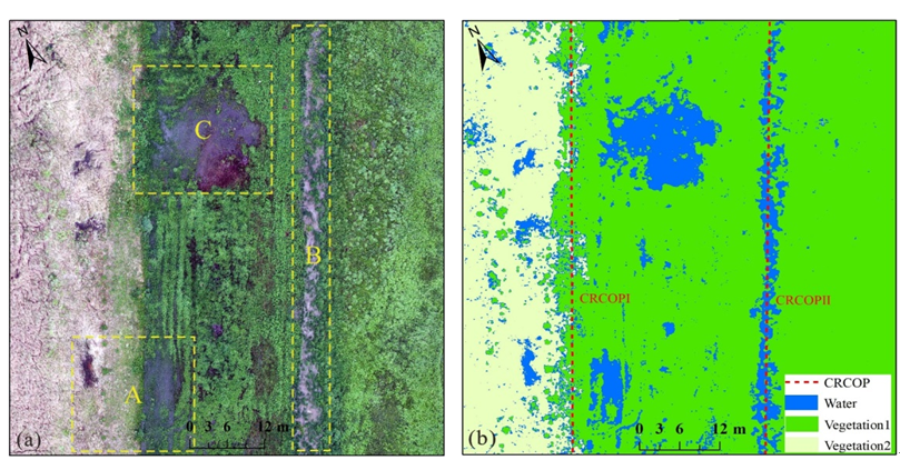 圖3 管道沿線積水分布?。╝)無人機(jī)正射影像?。╞)影像監(jiān)督分類結(jié)果
