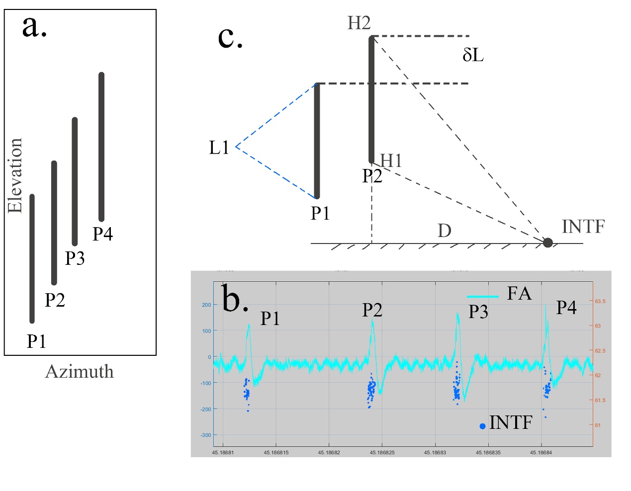圖2. VHF干涉儀(Fan et al.,2023a;2023b)對規(guī)則脈沖爆發(fā)序列中連續(xù)脈沖的二維觀測結(jié)果,顯示這些脈沖比正常的直竄先導(dǎo)速度更快,并且從一個(gè)脈沖到另一個(gè)脈沖之間重疊較強(qiáng)?。╝)。從平面距離 D?。健?.8 公里和干涉儀仰角的差異(例如,60.5° 和 60°),可以得出脈沖的 VHF輻射源的垂直范圍約為 205 米 (c)。這一現(xiàn)象發(fā)生在約 2 微秒的時(shí)間間隔內(nèi),對應(yīng)的速度約為 108 米/秒。脈沖代表的擊穿速度遠(yuǎn)高于已知的閃電先導(dǎo)通道發(fā)展速度。