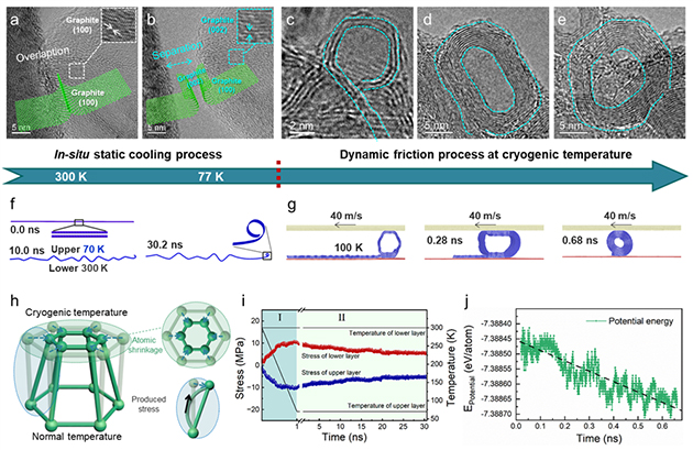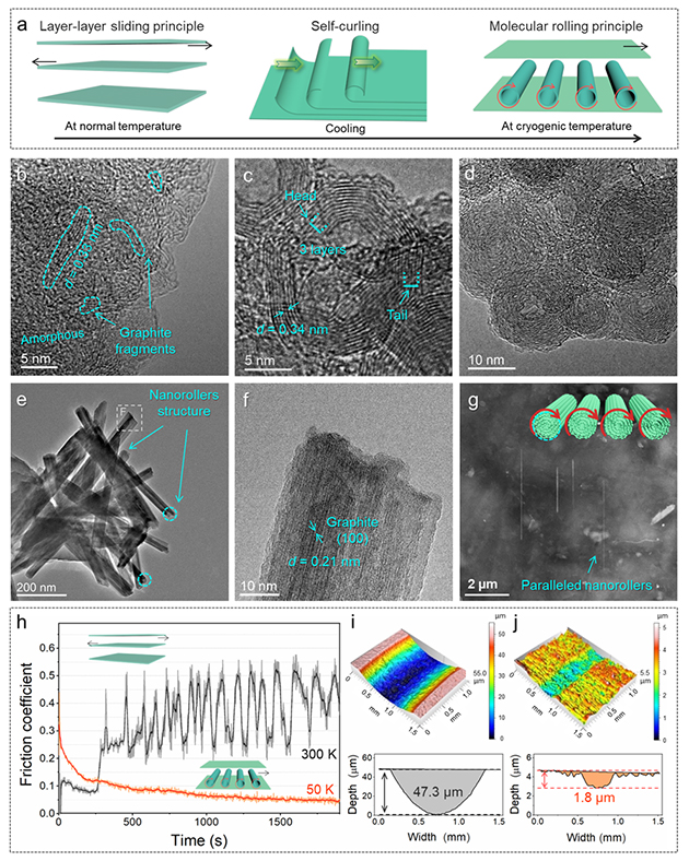 相關(guān)研究成果以“Acquisition of molecular rolling lubrication by self-curling of graphite nanosheet at cryogenic temperature” 為題發(fā)表在Nature Communications(2024, 5, 5747; https://doi.org/10.1038/s41467-024-49994-4)上。蘭州化物所博士后李畔畔和項目副研究員何文豪為論文共同第一作者,吉利研究員、魯志斌研究員、李紅軒研究員和陳建敏研究員為共同通訊作者。