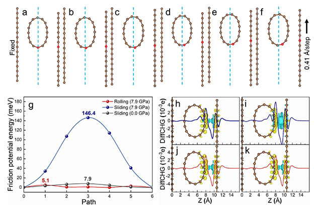 研究團(tuán)隊發(fā)現(xiàn)石墨納米片在100K以下靜態(tài)低溫條件下會發(fā)生邊緣自卷翹的奇特現(xiàn)象;利用這一效應(yīng),在摩擦過程中剪切力可進(jìn)一步驅(qū)動其在摩擦界面上原位形成納米卷軸結(jié)構(gòu),掃描電鏡圖像顯示這些納米卷軸呈現(xiàn)平行排列,且與滑動方向垂直,證明其發(fā)生了分子滾動潤滑。同時石墨表現(xiàn)出反常的宏觀真空潤滑特性,在50K真空條件下,潤滑狀態(tài)變得平穩(wěn)而長效,摩擦系數(shù)約0.06,磨損率僅為300 K時的1/50。通過密度泛函理論模擬計算,進(jìn)一步揭示了分子滾動過程界面電荷能量耗散減弱的機制。該研究為解決傳統(tǒng)石墨類材料真空潤滑性能差和超低溫潤滑領(lǐng)域難題提供了全新解決思路和方案。