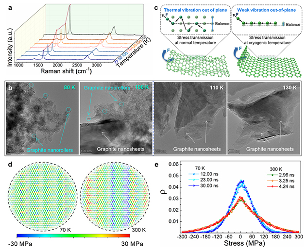 結(jié)合實驗和理論模擬系統(tǒng),研究團(tuán)隊研究了石墨納米片邊緣自卷翹形變的影響因素、結(jié)構(gòu)演變和形成機理。結(jié)果表明,超低溫環(huán)境下,非平衡溫度場導(dǎo)致了原子的不均勻收縮,石墨片上下表面產(chǎn)生了方向相反的應(yīng)力,驅(qū)動了石墨片邊緣的自卷翹;同時發(fā)現(xiàn)熱振動對原子間應(yīng)力傳遞的耗散作用,當(dāng)溫度低于100K時,原子熱振動顯著減弱,原子間應(yīng)力傳遞耗散被抑制,促進(jìn)了石墨納米片自卷翹形變的發(fā)生。該研究將為認(rèn)識微觀粒子受力傳遞規(guī)律和納米形變機理提供新的理解,同時發(fā)現(xiàn)了一種利用溫度操控自卷曲納米形變行為的新方法,在潤滑、傳感等眾多領(lǐng)域具有廣泛應(yīng)用價值。