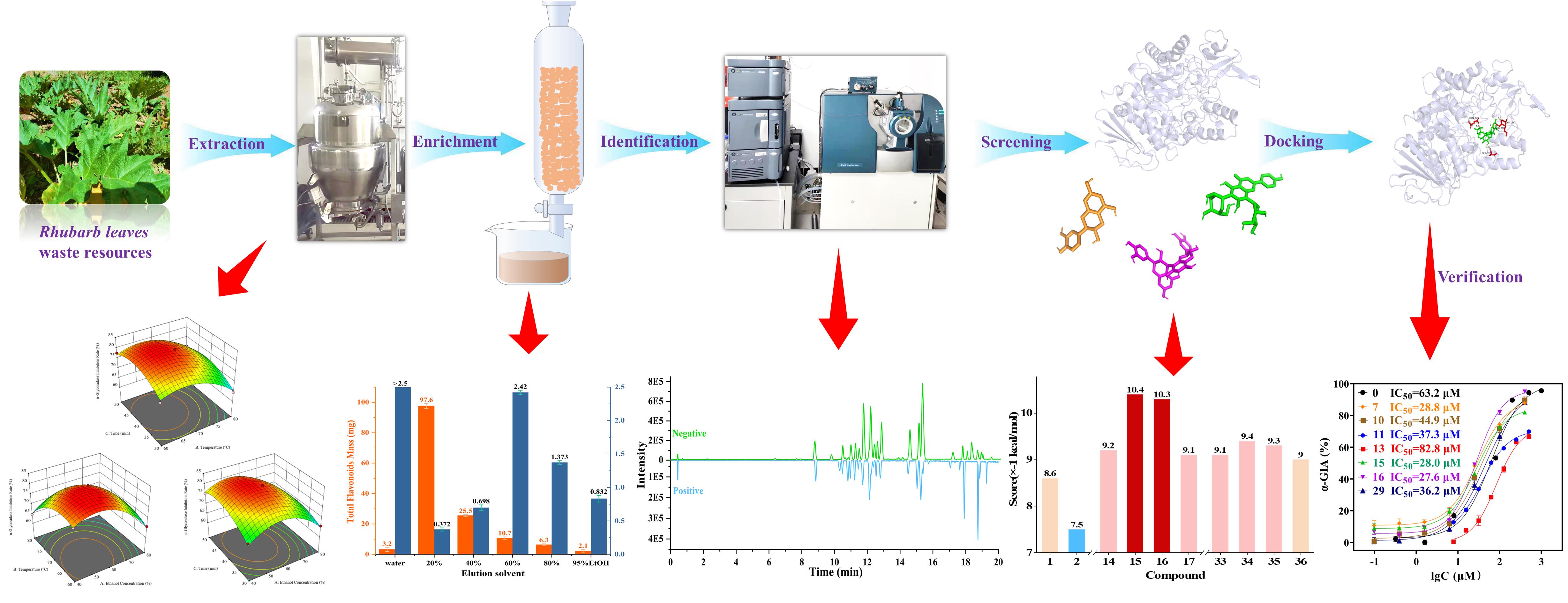 中國科學院西北高原生物研究所高原藏藥資源質(zhì)控與藥理毒理評價研究團隊以α-葡萄糖苷酶抑制活性作為關鍵評價指標,建立了基于大孔吸附樹脂富集、UPLC-QTOF-MS/MS分析表征、分子對接、體外驗證的唐古特大黃葉中α-葡萄糖苷酶抑制劑的系統(tǒng)篩選策略,篩選得到myricitrin、rumarin等6個α-葡萄糖苷酶抑制劑。基于穩(wěn)態(tài)、同步、三維熒光光譜和遠紫外圓二色譜等多光譜技術的對接機制研究表明,6個抑制劑均能與α-葡萄糖苷酶發(fā)生結(jié)合并改變靶蛋白的酪氨酸和色氨酸殘基微環(huán)境,通過降低靶蛋白α-螺旋或β-轉(zhuǎn)角等二級結(jié)構(gòu)的含量從而導致蛋白酶失活,該研究為唐古特大黃廢棄資源的利用提供了新的見解。