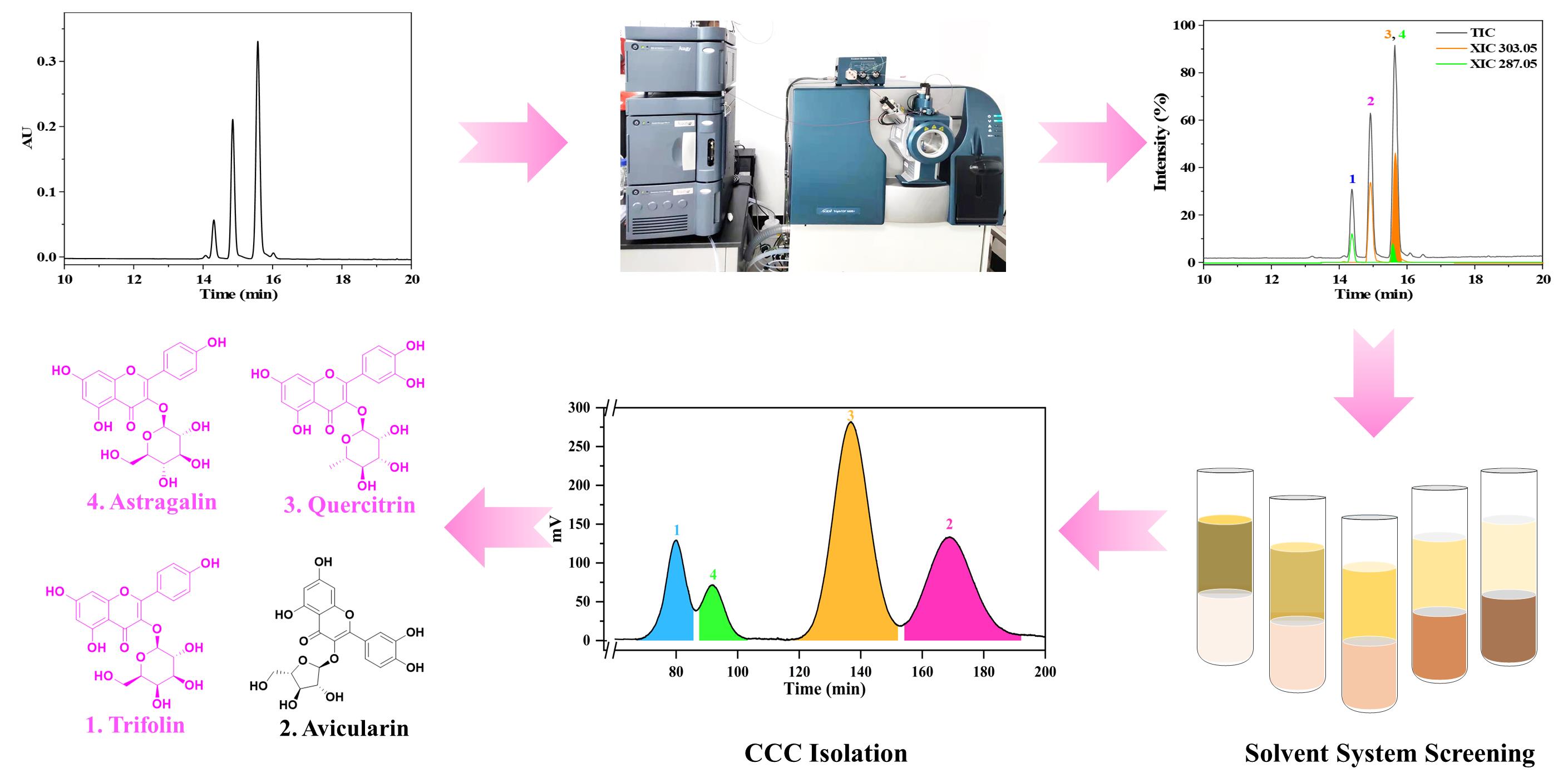 另外,由于天然產(chǎn)物組成成分和結(jié)構(gòu)復雜多樣,常常會出現(xiàn)色譜共洗脫現(xiàn)象,難以被發(fā)現(xiàn)、分析和分離。針對這一挑戰(zhàn),研究團隊提出一種基于UPLC-QTOF-MS/MS和CCC的HPLC共洗脫異構(gòu)體的差異識別和靶向分離策略。通過UPLC-QTOF-MS/MS實現(xiàn)了對共洗脫異構(gòu)體的差異特征精確識別和準確定量,解決了共洗脫異構(gòu)體無法進行CCC溶劑系統(tǒng)篩選的關鍵技術問題?;诖瞬呗?,成功從唐古特大黃葉中分離得到astragalin等四種高純度的黃酮類化合物,其中三個互為異構(gòu)體。該研究為天然產(chǎn)物分離過程中共洗脫異構(gòu)體的分析和分離提供了新的思路。
