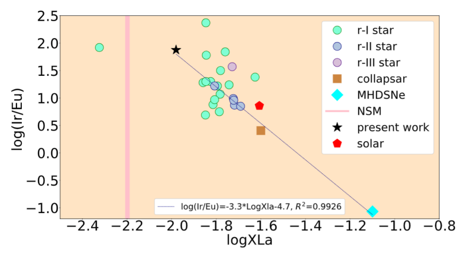 研究人員發(fā)現(xiàn)CEJSNe是目前最強(qiáng)的超鑭元素合成地點(diǎn)。在提取了被標(biāo)定為r-過程增強(qiáng)星的天文觀測(cè)量及相關(guān)理論模型值后,研究發(fā)現(xiàn) CEJSNe與其它理論模型呈現(xiàn)出很好的反關(guān)聯(lián)關(guān)系。這表明,豐富的稀土元素和超鑭元素不能同時(shí)出現(xiàn)在同一次r-過程核合成中。研究同時(shí)指出,如果沒有CEJSNe,r-過程增強(qiáng)星的觀測(cè)值將很難被理論模型解釋,因此該研究進(jìn)一步提升了r-過程核合成理論的完備性。