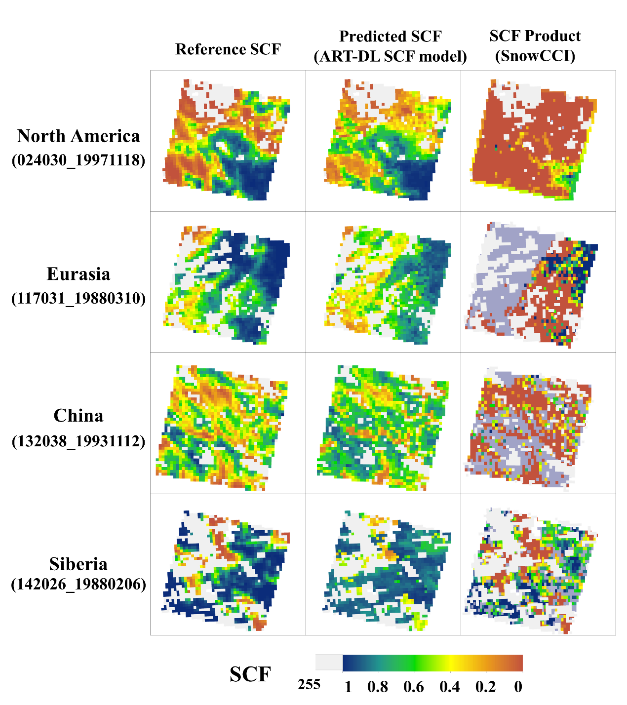 與Landsat參考SCF的綜合驗(yàn)證結(jié)果顯示,整體準(zhǔn)確率為90.20%,錯(cuò)分誤差和漏分誤差均在10%以下。值得注意的是,引入物理約束既提高了模型的準(zhǔn)確性和穩(wěn)定性,又減輕了低估問題。與沒有物理約束的模型相比,ART-DL SCF模型的均方根誤差顯著降低了4.79個(gè)百分點(diǎn),平均絕對(duì)誤差降低了5.35個(gè)百分點(diǎn)。這些準(zhǔn)確度明顯高于歐洲空間局 (ESA) 目前可用的 SnowCCI AVHRR產(chǎn)品。