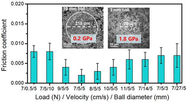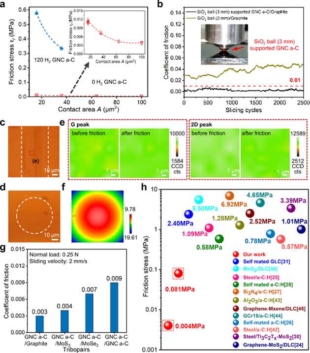同時(shí),研究人員發(fā)現(xiàn)碳薄膜表面石墨烯片段之間彼此排列角度各異、呈現(xiàn)出無序性。這種結(jié)構(gòu)無序性誘導(dǎo)與石墨表面之間非公度性,加之薄膜整體成型制備避免了石墨烯邊緣暴露,有效減弱了阻礙結(jié)構(gòu)超潤滑放大的邊緣效應(yīng),從而通過石墨島尺度逐級增加,實(shí)現(xiàn)了濕度不敏感超潤滑跨尺度放大。本研究也存在不足,近似無磨損的設(shè)計(jì),限制了體系承載性等性能的提高。