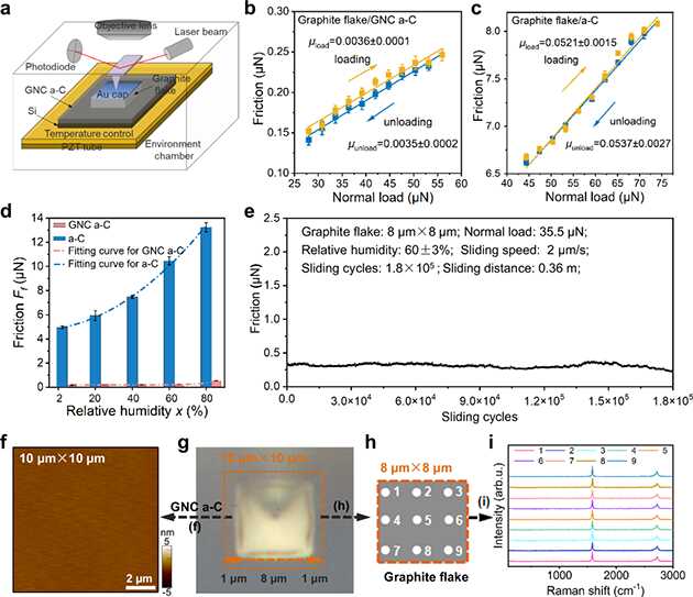 近日,研究人員針對固體表面濕度敏感、超潤滑跨尺度易失效等基礎(chǔ)科學(xué)問題開展系統(tǒng)研究?;谖墨I(xiàn)調(diào)研,發(fā)現(xiàn)固體表面濕度敏感源于磨損后暴露的新表面,導(dǎo)致與水分子作用強(qiáng)烈的化學(xué)斷鍵形成。研究人員提出了運(yùn)動界面“(近似)無磨損無化學(xué)反應(yīng)”思路,通過磁控濺射物理氣相沉積技術(shù),制備石墨烯覆蓋表面的納米結(jié)構(gòu)碳薄膜,構(gòu)建碳薄膜/微觀石墨島體系,實(shí)現(xiàn)了穩(wěn)健、濕度不敏感超潤滑(即相對濕度2-80%下均實(shí)現(xiàn)超滑)。鑒于界面近似無磨損特性,該體系表現(xiàn)出結(jié)構(gòu)性超潤滑性質(zhì)。