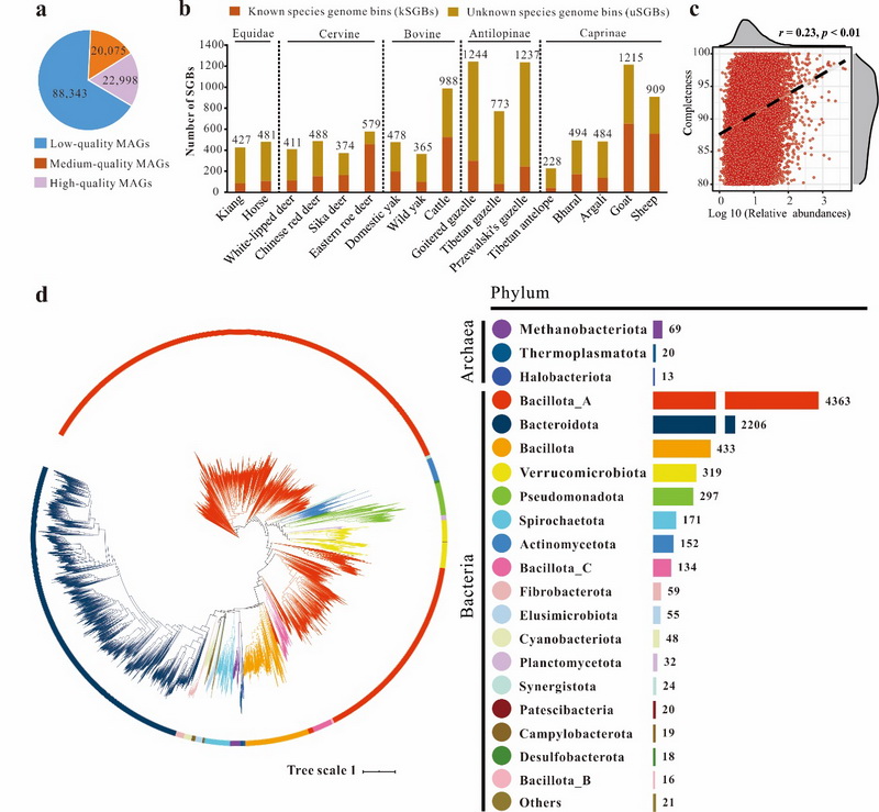 中國科學(xué)院西北高原生物研究所動物生態(tài)與資源保護研究團隊以中國境內(nèi)奇蹄目(Perissodactyla)和鯨偶蹄目(Cetartiodactyla)17個常見有蹄類物種為研究對象,通過大規(guī)模宏基因組測序和組裝、分箱和注釋,獲得131,416個宏基因組組裝基因組(MAGs),其中包含22,998個高質(zhì)量MAGs和11,175個菌種水平基因組(SGBs),成功構(gòu)建了中國典型有蹄類物種的腸道微生物宏基因組圖譜,其中60%左右的SGBs為本研究首次報道。