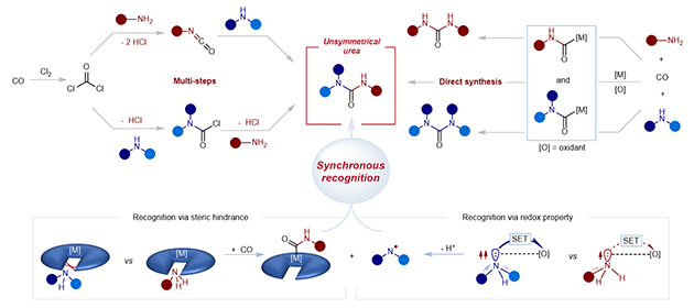 如何基于不同胺物理化學(xué)性質(zhì)的細(xì)微差異,讓兩種不同胺片段找準(zhǔn)位置,連接在同一羰基位點(diǎn),一步合成非對(duì)稱脲是一個(gè)挑戰(zhàn)性難題。中國(guó)科學(xué)院蘭州化學(xué)物理研究所低碳催化與二氧化碳利用重點(diǎn)實(shí)驗(yàn)室何林研究員團(tuán)隊(duì)與武漢大學(xué)雷愛文教授團(tuán)隊(duì)合作,提出了同步胺識(shí)別的概念,在鈷催化中心,當(dāng)一級(jí)胺與二級(jí)胺共存時(shí),僅有一級(jí)胺發(fā)生羰化生成酰基物種,表現(xiàn)出鈷物種對(duì)一級(jí)胺的選擇性識(shí)別;在銅催化中心,一級(jí)胺與二級(jí)胺與銅相互作用過程中,二級(jí)胺能夠快速生成自由基物種,表現(xiàn)出銅物種對(duì)二級(jí)胺的傾向性識(shí)別。首創(chuàng)性利用上述識(shí)別效應(yīng),在胺氧化羰基化一個(gè)催化反應(yīng)中融合親核羰基化半反應(yīng)與自由基生成轉(zhuǎn)化半反應(yīng)全新反應(yīng)機(jī)制,獲得了一步合成非對(duì)稱脲的獨(dú)特反應(yīng)窗口。