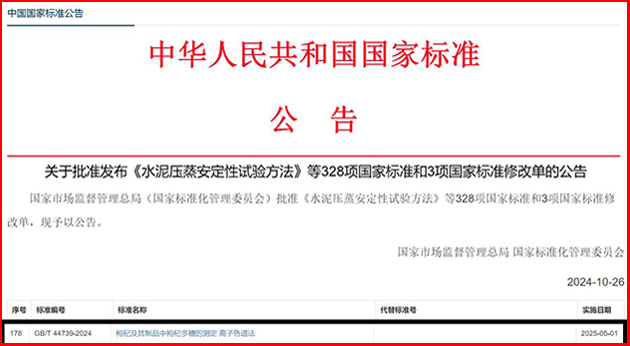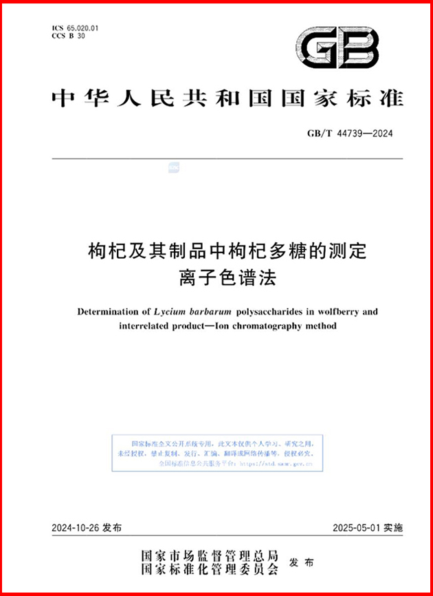 該團(tuán)隊(duì)自2019年起,以枸杞多糖為研究對(duì)象,開展了枸杞多糖含量分析新方法的研究和國(guó)家標(biāo)準(zhǔn)的制訂。10月26日,由蘭州化物所牽頭、寧夏回族自治區(qū)藥品檢驗(yàn)研究院等單位參與制訂的國(guó)家標(biāo)準(zhǔn)《枸杞及其制品中枸杞多糖的測(cè)定 離子色譜法》(GB/T 44739-2024),由國(guó)家市場(chǎng)監(jiān)督管理總局(國(guó)家標(biāo)準(zhǔn)化管理委員會(huì))批準(zhǔn)發(fā)布,將于2025年5月1日正式實(shí)施。