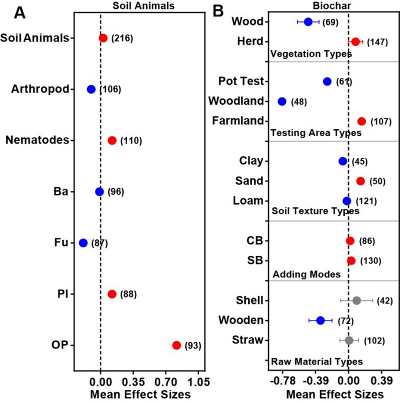 近年來(lái),全球范圍內(nèi)對(duì)生物炭作為土壤調(diào)節(jié)劑的應(yīng)用興趣顯著增加。土壤動(dòng)物在土壤生態(tài)系統(tǒng)中種類繁多,并對(duì)土壤環(huán)境的變化表現(xiàn)出高度敏感性。它們?cè)谠u(píng)估不同田間管理?xiàng)l件和土地利用狀況下的土壤健康方面發(fā)揮著至關(guān)重要的作用。生物炭對(duì)土壤動(dòng)物的影響既包括土壤動(dòng)物的直接取食作用,也涉及生物炭對(duì)土壤環(huán)境的間接影響。然而,目前尚缺乏關(guān)于生物炭添加對(duì)土壤動(dòng)物影響的系統(tǒng)性和定量性研究。薈萃分析能夠促進(jìn)對(duì)已有研究結(jié)果的定量整合,通過(guò)整合多個(gè)發(fā)現(xiàn),尤其是在特定主題下樣本量相對(duì)較小的情況下,可以提高統(tǒng)計(jì)效率,解決研究結(jié)果間的不一致性,探討現(xiàn)有文獻(xiàn)中的發(fā)表偏差,制定新的研究問(wèn)題,并為進(jìn)一步分析研究提供理論性框架和標(biāo)準(zhǔn)化體系。