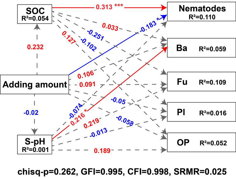 中國(guó)科學(xué)院西北高原生物研究所高寒濕地生態(tài)系統(tǒng)近自然修復(fù)與功能提升研究團(tuán)隊(duì)開(kāi)展了一項(xiàng)薈萃分析,旨在研究生物炭添加對(duì)不同處理和實(shí)驗(yàn)條件下土壤動(dòng)物的影響。結(jié)果表明:(1)生物炭的添加顯著增加了土壤動(dòng)物的豐度(0.027),并改變了其群落結(jié)構(gòu);(2)生物炭促進(jìn)了土壤線蟲的豐度(0.124),而抑制了土壤節(jié)肢動(dòng)物的豐度(?0.101);(3)生物炭通過(guò)直接和間接途徑影響土壤動(dòng)物的豐度,其中最顯著的途徑是由土壤有機(jī)碳(SOC)和土壤pH值介導(dǎo)的。生物炭添加的數(shù)量和持續(xù)時(shí)間對(duì)不同線蟲物種的豐度產(chǎn)生了不同的影響,最終導(dǎo)致土壤微型食物網(wǎng)結(jié)構(gòu)的改變。
