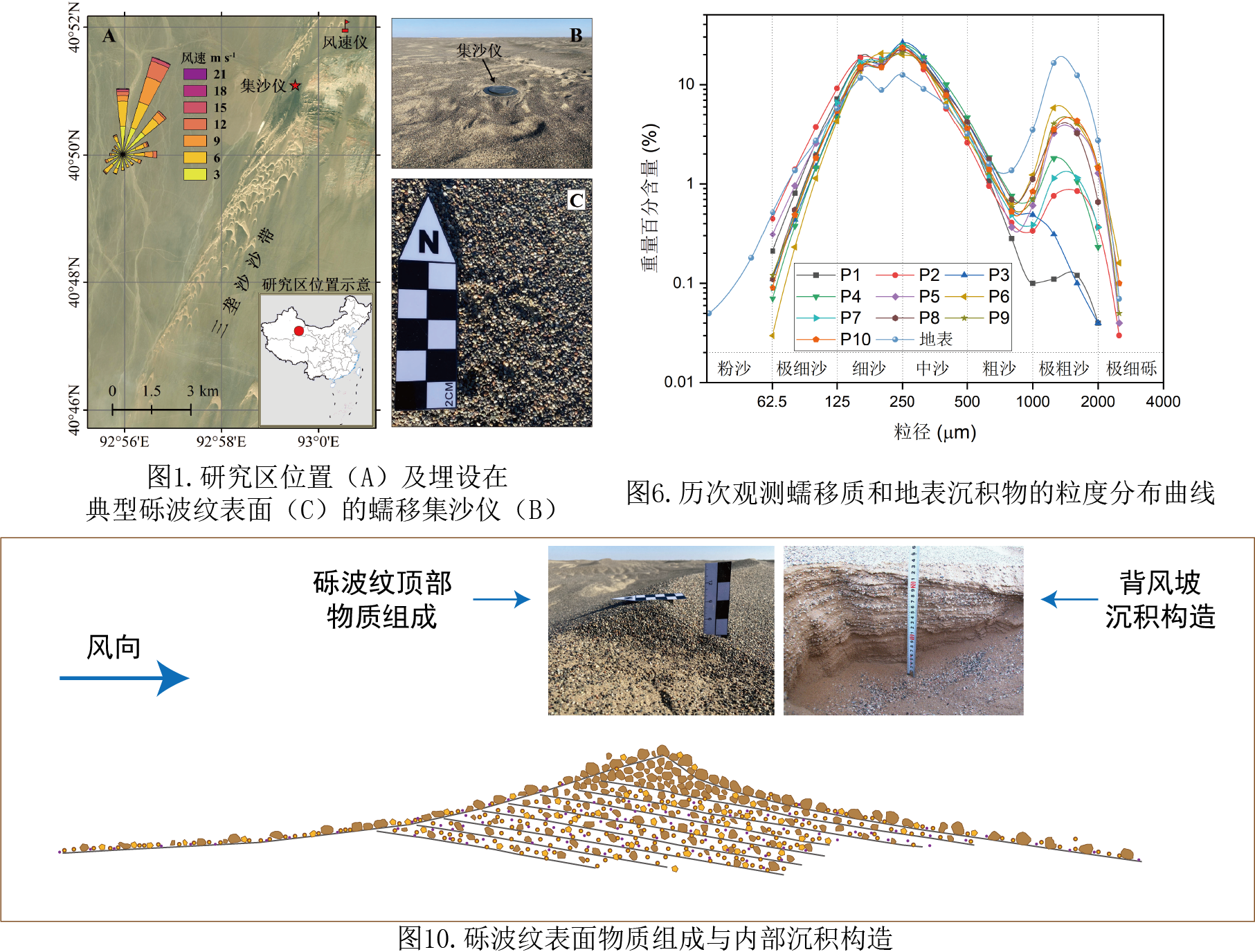 研究發(fā)現(xiàn),蠕移輸沙通量與起沙風(fēng)平均風(fēng)速之間存在相關(guān)性,最強(qiáng)的蠕移輸沙過(guò)程發(fā)生在夏季沙塵暴期間,而最弱的發(fā)生在冬季。除了風(fēng)況之外,沉積物粒度特征、不同方向的沙源供應(yīng)程度均影響蠕移輸沙通量和物質(zhì)組成。從沉積學(xué)上來(lái)看,礫波紋表面的蠕移運(yùn)動(dòng),對(duì)其內(nèi)部“滲入”結(jié)構(gòu)和粗細(xì)互層的前積紋層形成具有重要貢獻(xiàn)。