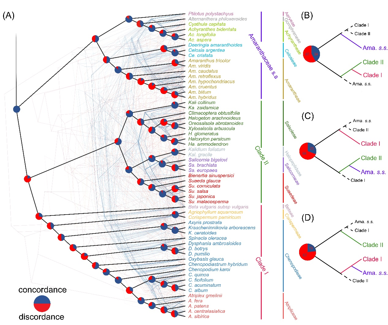 中國科學(xué)院西北高原生物研究所青藏高原植物適應(yīng)與進(jìn)化研究團(tuán)隊(duì)綜合利用質(zhì)體基因組和全長ITS序列,重建了廣義莧科的系統(tǒng)發(fā)育關(guān)系。通過質(zhì)體基因組結(jié)構(gòu)和序列比對分析,發(fā)現(xiàn)濱藜屬(Atriplex)和藜屬(Chenopodium)存在一段長約5200 bp的反向互補(bǔ)區(qū)域。適應(yīng)性進(jìn)化分析揭示了8個基因受到顯著的正選擇作用,這些基因可能在廣義莧科的進(jìn)化中起到了驅(qū)動作用。系統(tǒng)發(fā)育結(jié)果表明,傳統(tǒng)藜科為單系類群,建議恢復(fù)其至科級分類學(xué)水平。對于廣義莧科的科級以下分類群,例如藜屬、鹽生草屬(Halogeton)以及豬毛菜亞族(Subtr. Salsolinae)為并系類群,建議通過建立更多的分類群或?qū)⑥甲澹–henopodieae)和濱藜族(Atripliceae)合并來解決分類問題。核質(zhì)沖突及不完全譜系分選是導(dǎo)致廣義莧科基因樹系統(tǒng)發(fā)育不一致的主要原因。本研究為廣義莧科的系統(tǒng)發(fā)育關(guān)系提供了新的見解,并指出后續(xù)仍需采取多種數(shù)據(jù)集完善廣義莧科的分類修訂。