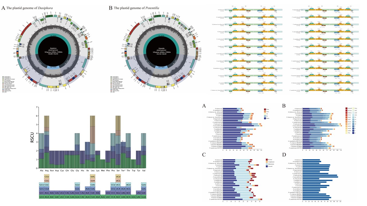 研究結(jié)果以“Comparative and phylogenetic analysis of Potentilla and Dasiphora (Rosaceae) based on plastid genome”為題,于2025年2月10日在BMC Plant Biology(中國(guó)科學(xué)院二區(qū)Top,IF=4.3)發(fā)表。西北高原所碩士研究生李孝平為第一作者,西北高原所張發(fā)起研究員為通訊作者。該工作得到了第二次青藏高原綜合科學(xué)考察研究、青海省重大科技專(zhuān)項(xiàng)、中國(guó)科學(xué)院戰(zhàn)略生物資源計(jì)劃、中國(guó)科學(xué)院-青海省三江源國(guó)家公園聯(lián)合研究專(zhuān)項(xiàng)和中國(guó)科學(xué)院“西部之光”人才培養(yǎng)計(jì)劃等項(xiàng)目資助。
