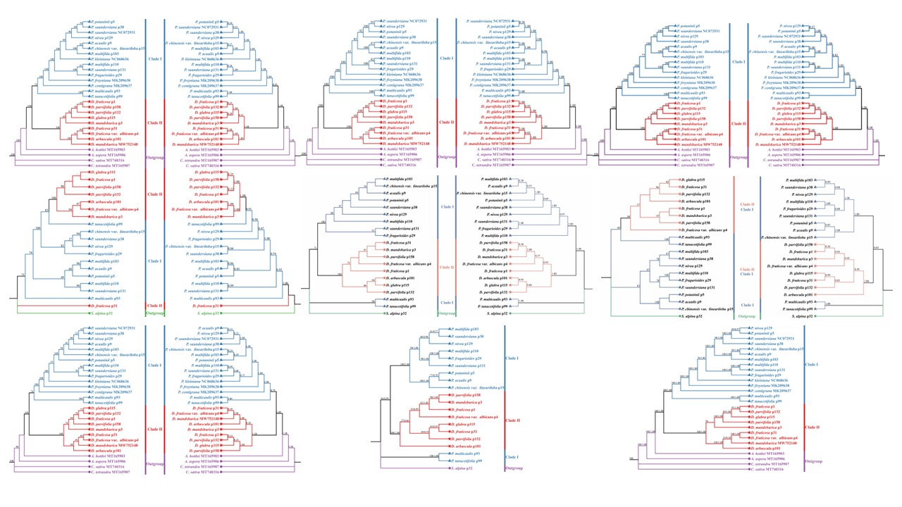 中國(guó)科學(xué)院西北高原生物研究所青藏高原植物適應(yīng)與進(jìn)化研究團(tuán)隊(duì)選擇了19個(gè)委陵菜屬和金露梅屬的全質(zhì)體基因組進(jìn)行Illumina二代測(cè)序,重建了該類(lèi)群的系統(tǒng)發(fā)育關(guān)系,并研究了他們之間的核質(zhì)沖突關(guān)系。研究結(jié)果表明,這些質(zhì)體基因組的結(jié)構(gòu)、GC含量和基因組成都高度保守,包含84個(gè)CDS、37個(gè)tRNA基因和8個(gè)rRNA基因。此外,所有金露梅屬質(zhì)體基因組的rpl2失去了唯一的內(nèi)含子。比較基因組分析結(jié)果表明,質(zhì)體大小的差異歸因于LSC區(qū)、SSC區(qū)和IRS區(qū)的長(zhǎng)度差異,并且IR區(qū)大部分是保守的,非編碼區(qū)比編碼區(qū)具有更高的差異性。我們篩選了SSR,發(fā)現(xiàn)了7個(gè)高度可變位點(diǎn),可作為潛在的分子標(biāo)記,在闡明委陵菜屬和金露梅屬的屬間關(guān)系上具有一定的參考意義。通過(guò)核基因(ITS、ETS)和細(xì)胞質(zhì)基因(質(zhì)體、線粒體)構(gòu)建的系統(tǒng)發(fā)育樹(shù),確定了委陵菜屬和金露梅屬的單系性。我們?cè)谖瓴藢僦袡z測(cè)到了核質(zhì)沖突,這種沖突往往會(huì)導(dǎo)致其單系性發(fā)生變化,我們推測(cè)可能在其進(jìn)化過(guò)程中發(fā)生了一定程度的種間雜交或不完整譜系分選事件。本研究通過(guò)對(duì)委陵菜屬和金露梅屬的系統(tǒng)發(fā)育比較分析,為該類(lèi)群之間的分類(lèi)學(xué)研究奠定基礎(chǔ)。