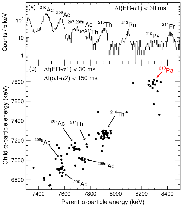 圖1:實驗測得的α衰變能譜和母子核α粒子能量的二維符合散點圖