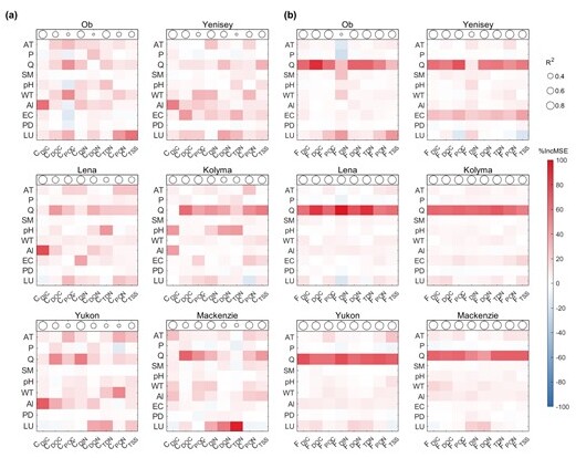 該研究利用隨機森林模型,集成了包括氣候、水文特征、河流化學性質(zhì)、土地覆蓋以及人口密度在內(nèi)的共30個潛在影響因子,通過置換重要性(%IncMSE)量化潛在影響因子的相對貢獻,發(fā)現(xiàn)水文特征(%IncMSE:63.2 ± 15.4%)在驅(qū)動泛北極地區(qū)河流碳氮輸出中占主導地位。