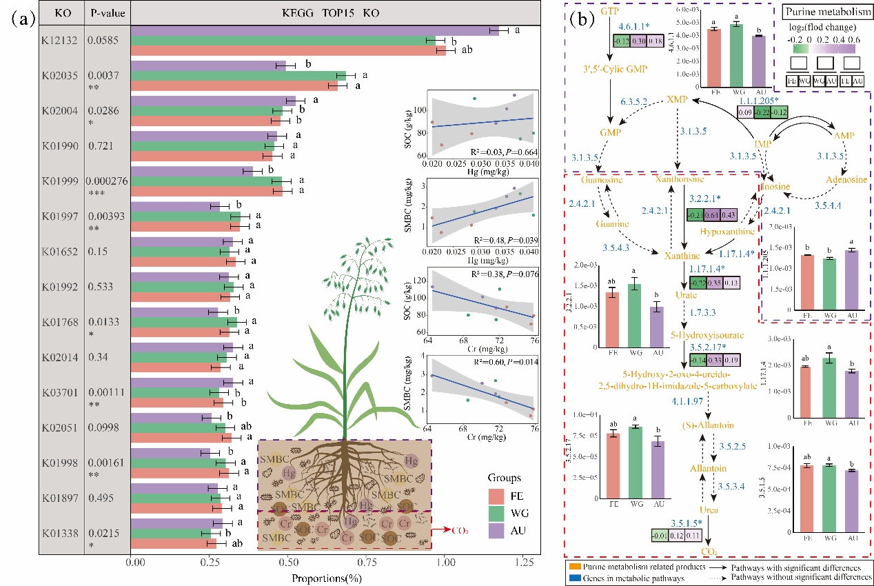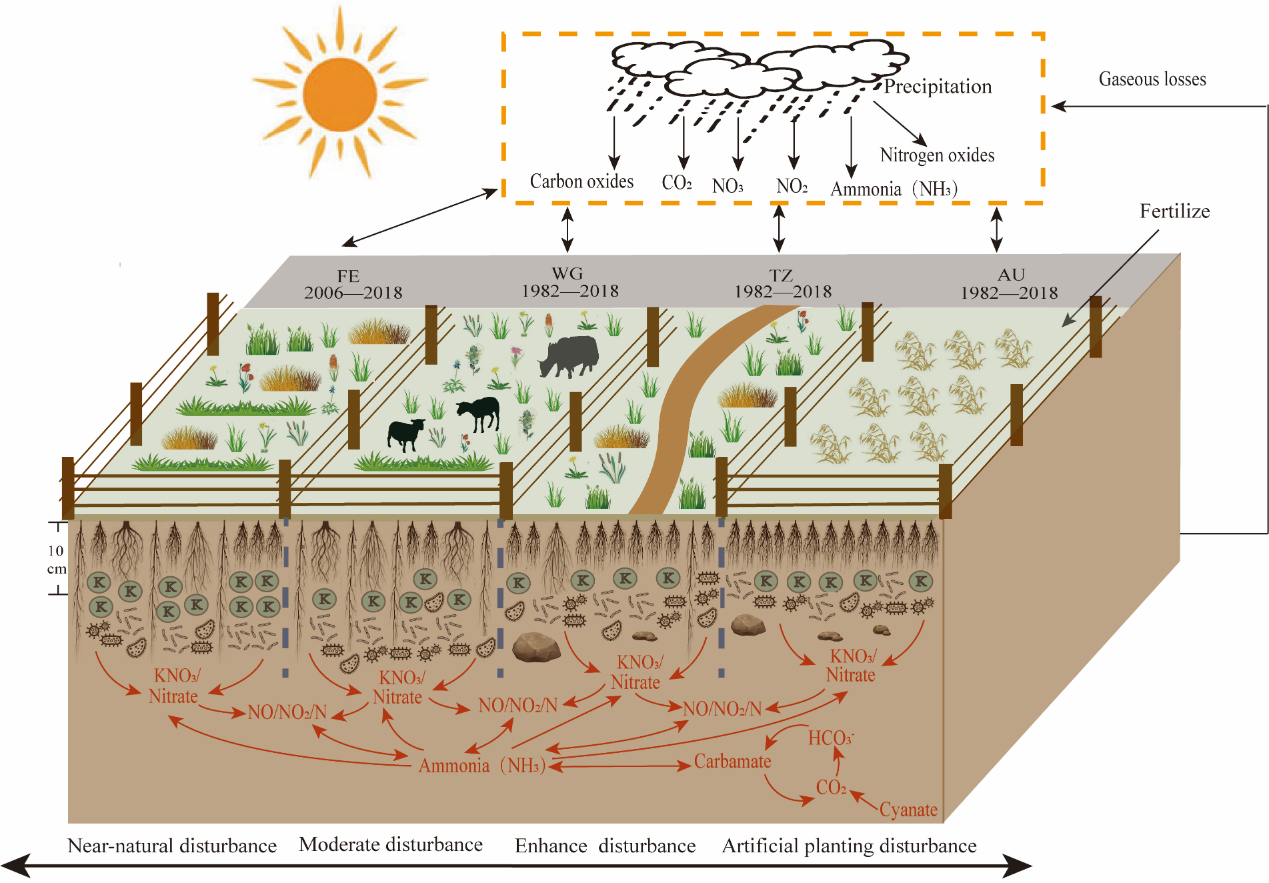 針對這一問題,中國科學院西北高原生物研究所三江源草原生態(tài)系統(tǒng)國家觀測研究站團隊在青藏高原祁連山南麓選擇了圍封(FE)、冬季放牧(WG)和開墾(AU)3種不同干擾的草地管理措施為研究對象,探明了微生物群落結(jié)構(gòu)和功能如何響應因草地管理引起的植被群落和PTEs的變化,以及對它們的調(diào)控路徑。研究結(jié)果表明,草地管理措施改變了地上禾本科和豆科植被群落的結(jié)構(gòu)及地下生物量的分配,導致K的分布變化,進而引起真菌群落結(jié)構(gòu)和氮代謝酶的顯著變化。Cr和Hg與微生物相互作用影響SOC和SMBC的代謝過程,可能對高寒草甸固碳具有一定積極作用,并且高寒草甸對PTEs具有良好的抗性。適度干擾的冬季放牧(WG)有利于維持高寒草地微生物群落結(jié)構(gòu)和功能的穩(wěn)定性。本研究為青藏高原祁連山高寒草甸的改善提供科學依據(jù)。