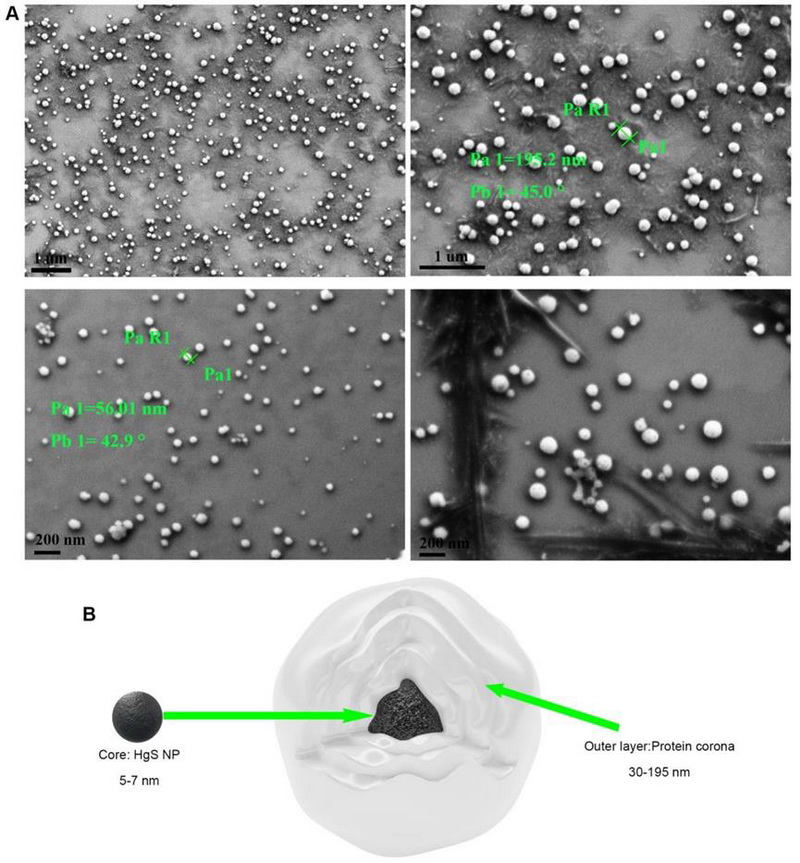 中國科學院西北高原生物研究所高原藥用資源生態(tài)保護與繁育研究團隊通過建立創(chuàng)新性金屬制劑研究體系,首次在細胞、小鼠和人體血液中證實金屬制劑能夠被生物合成為粒徑均一的HgS 納米顆粒。更重要的是通過分離純化手段首次觀察到具有完整蛋白冠的金屬納米顆粒。相對純凈完整結(jié)構(gòu)的呈現(xiàn)不僅直觀證實了蛋白冠的存在,也為蛋白冠中蛋白質(zhì)的分析奠定了基礎。蛋白冠蛋白質(zhì)組成一直以來存在巨大分歧。本研究中通過分析HgS納米顆粒蛋白質(zhì)組成,證實金屬納米顆粒蛋白冠中蛋白質(zhì)類型多樣,初步排除了蛋白冠僅由血清白蛋白組成的相關報道。